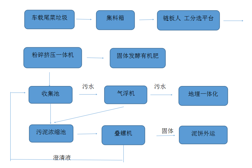 尾菜來料后進(jìn)入集料箱緩存,然后經(jīng)底部螺旋輸送至鏈板平臺;鏈板輸送機(jī)設(shè)計(jì)為“Z”型,后端作為人工分選平臺,中間設(shè)備自動除鐵器,去除尾菜垃圾中的鐵制品;經(jīng)過分選的尾菜垃圾隨后進(jìn)入粉碎擠壓一體機(jī)進(jìn)行減量。經(jīng)過擠壓后的固體垃圾進(jìn)入發(fā)酵倉進(jìn)行發(fā)酵,用作有機(jī)肥;液體進(jìn)入收集池中緩存。收集池中的液體隨后泵入氣浮機(jī),去除大量懸浮物,氣浮后的浮渣進(jìn)入疊螺機(jī),污水則進(jìn)入地埋一體化設(shè)備,*后達(dá)標(biāo)排放。